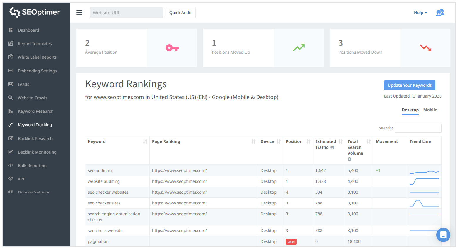 SEOptimer ti consente di monitorare le tue posizioni delle parole chiave nel tempo, così non dovrai mai indovinare dove ti trovi.